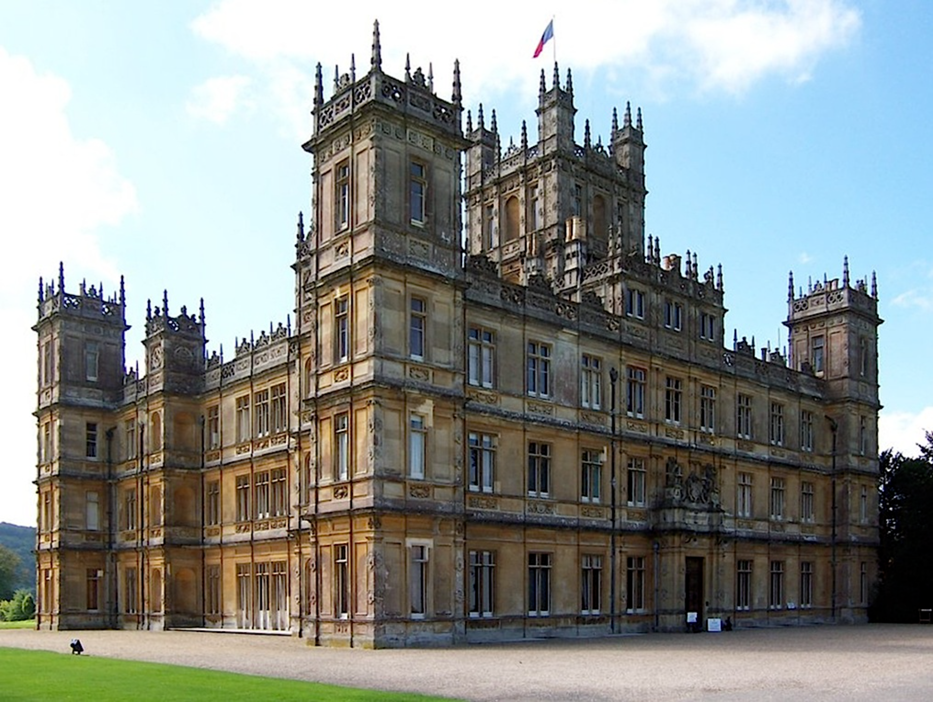 用于拍摄唐顿庄园外景及室内场景的海克利尔城堡(Highclere Castle)照片。(本文件采用知识共享署名 2.0 通用许可协议授权。图片作者:JB + UK_Planet,是否对作品做出修改:否)