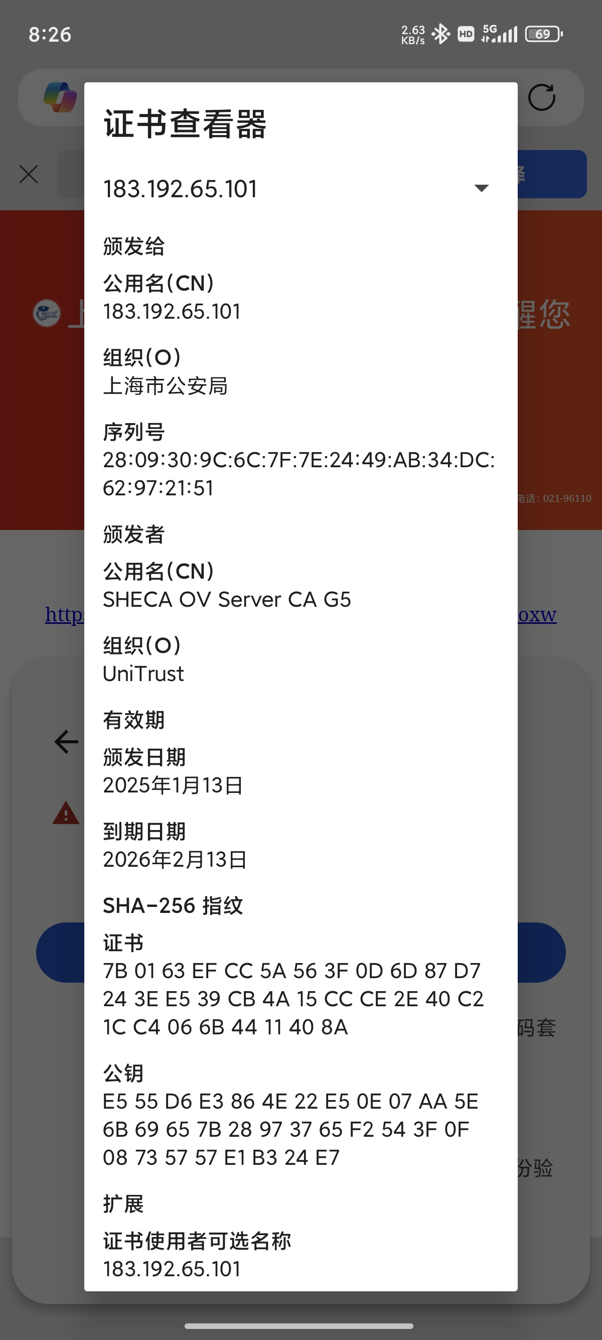 183.192.65.101 非上海市公安局的网站,它通过中间人攻击以重定向我的网站到仿照上海市反诈中心的钓鱼网站,并使用其他企业的备案,以增加可信度。那它为何会获得上海市公安局的证书(有可能这个证书组织是写的“上海市公安局”,实际上并不是,以继续增加可信度)?为何要攻击我的网站?【这个可能性很高】