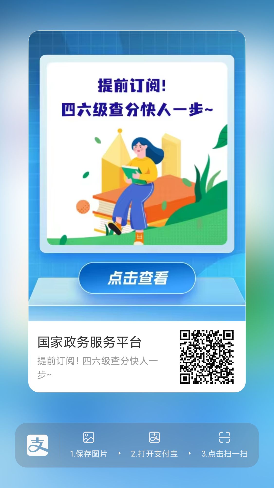 晚上,看到国家政务服务平台在支付宝上,发了个“提前订阅!四六级查分快人一步”的视频。分享图:
